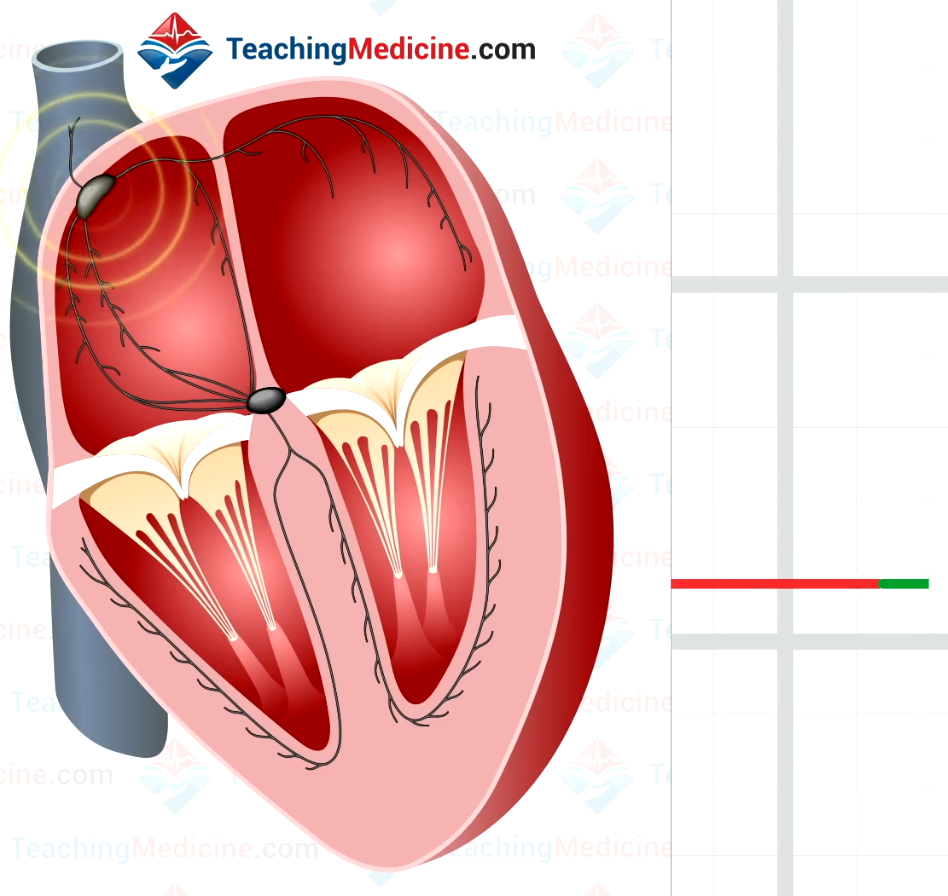 creates a downward moving electrical charge. The added black circle in the image below represents the positive ECG electrode and in this case, we are using lead II, which would be pointing from about the top left corner of the picture down toward the black circle. Because the atrial waveform is moving toward the positive electrode, the ECG tracing in